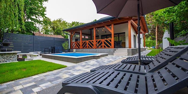 Üvegfalas nappaliból a több, mint 40 négyzetméteres teraszra léphetünk, ahol 6 férőhelyes jakuzzi várja a Nyaralókat, mellette 12 férőhelyig kényelmesen bővíthető antracit étkezővel. Kertrészen: medence, napozóterasz, grillezési és bográcsozási lehetőség, játszóház. Parkolási lehetőség a kerten belül 5 autónak van lehetősége. Kényelemről és a biztonságról gondoskodik az elektromos kapu, elektromos redőny a földszinten, mosogatógép, kiépített kamerarendszer.