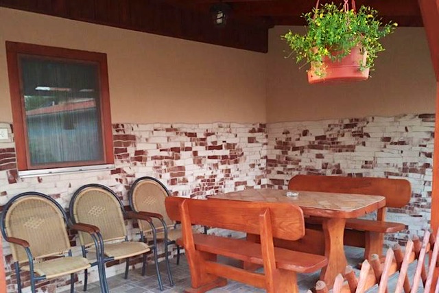 A parton egy 8 személyes asztal és hozzá tartózó padok és egy kb 12 m2-es móló található napágyakkal. A fedett terasz, kerti bútorokkal, minden kényelmet biztosít az idelátogatóknak. A nyaraló maximum 7 fő fogadására alkalmas. Egy 3 ágyas és egy 2 ágyas szoba és a nappaliban 2 személyes kihúzható kanapé áll a vendégek rendelkezésére. A hálószobákban sötétítő függöny, az ablakon szúnyogháló van felszerelve. Kérésre etetőszéket, utazóágyat, gyermekkádat tudunk biztosítani. A nyaralóban vezetékes víz van. Ágyneműt biztosítunk.