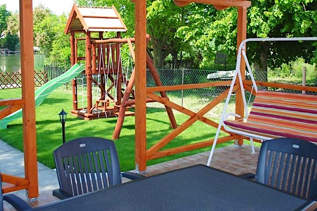 A vendégház zárt parkolóval, fa gyermekjátszótérrel (hinta, csúszda, homokozó), csónakkal, stéggel, kerti szalonna sütővel, bográcsozási és tárcsázási lehetőséggel rendelkezik. A vízparton egy kis kerítés található, így a kisgyermekek is biztonsággal tartózkodhatnak a nyaraló udvarán. A parton egy 8 személyes szaletli és egy 10 m2-es móló található napágyakkal. A 22 nm-es vízparti panorámás fedett terasz, kerti bútorokkal, hintaággyal minden kényelmet biztosít az idelátogatóknak.