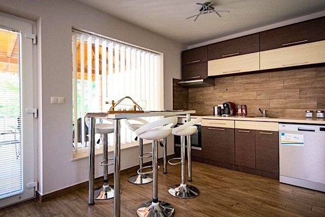 A kétszintes, 4+1 személyes vízparti nyaraló földszintjén amerikai konyhás, stílusosan kialakított nappali fogadja Vendégeinket, melyben TV, kandalló valamint egy személy részére pótágyazható sarokülő található. A konyha teljeskörűen felszerelt (elektromos főzőlap, sütő, hűtő fagyasztó rekesszel, vízforraló, mosogatógép, kávéfőző, ét-, pohár-, tányér- és edénykészlet különböző méretekben, 6 főre). A földszinten található továbbá a WC-vel, tusolókabinnal felszerelt fürdőszoba is. Az emeleten két klimatizált hálószoba került kialakításra, melyek közül az egyikben egy franciaágy, a másikban pedig 2 egyszemélyes ágy gondoskodik a pihentető kikapcsolódásról. A nyaralóban a hűtés-fűtésre alkalmas klíma mellett kandalló gondoskodik a kellemes hőmérsékletről a hidegebb napokon. Ágynemű, törölköző, ingyenes internet hozzáférés valamint vezetékes ivóvíz is biztosított.