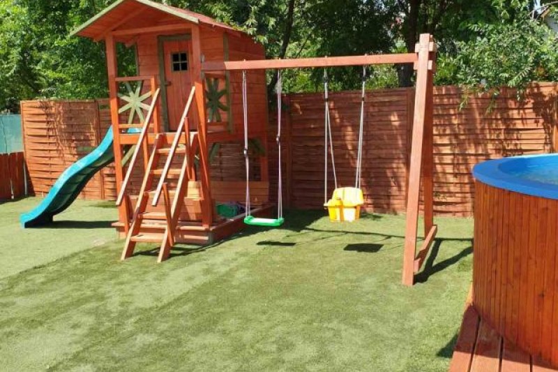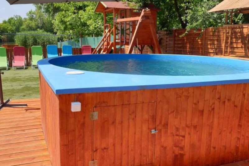 Gyerekeknek kis játszótér, 3, 6 méteres kör alakú medence, napozó ágyak, hintaágy, ping- pong asztal áll rendelkezésre. A parti rész kerítéssel elkerített a gyerekek védelme érdekében, itt található egy bográcsozó, melyhez tűzifát biztosítunk A nyaraló lassan járható földúton közelíthető meg földút: 1, 2 km Egyedi árakért keressen bizalommal. (EG21002934)