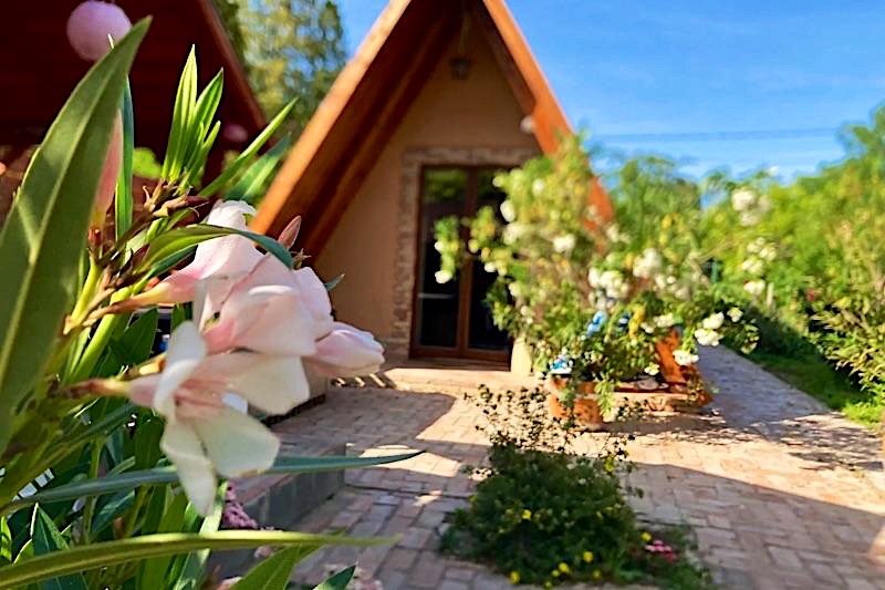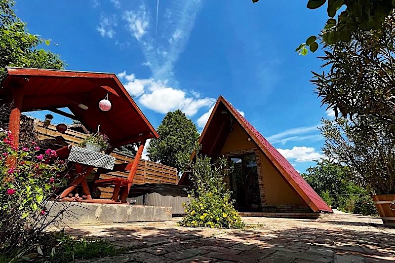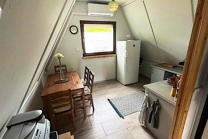 A pár száz méterre a vízi színháztól lévő kis (apartman)ház egyszerű, de takaros, elsősorban – saját használatra kialakított – saját használatú igényeknek megfeleltetett.Az alpesi tetejű, 40 m2 es szinte egy légterű kis házban, konyha, szoba, fürdőszoba, külön WC van kialakítva. Konyhában korrekt hűtő, mosogató, szerényen, de szinte minden konyhai kellékkel ellátott. Ezek mellet szemes kávéra való, egy menetben frissen daráló kávéfőző, mikrohullámú sütő, illetve egy egylapos indukciós főzőlap található. Judi a szobát, IKEA-s stílusban rendezte be és két IKEA-s kinyitható ágyon, négyen tudtok itt aludni. Az üveges szobaajtóból is rálátni a Körösre. A part és a kisház között, rusztikus tégla burkolattal ellátott kis terasz, fedett kerti kiülő és hinta szolgálja a kényelmes pihenést. Ez az egyik kedvencünk. E mellett a kialakított sütőhelyen, bográcsozásra és tárcsás sütésre kiváló lehetőségetek van, az eszközök biztosítottak. (Több méretű halfőző bogrács, többméretű általános bogrács, bográcsállvány, gázzsámoly és/vagy tűzrakó tér, tárcsa a sütéshez, nyársak a szalonnasütéshez). Ez a főzőcskézős rész, meg a barátaink kedvence. A mediterrános fílinget, fadézsákban elhelyezett leanderek idézik.