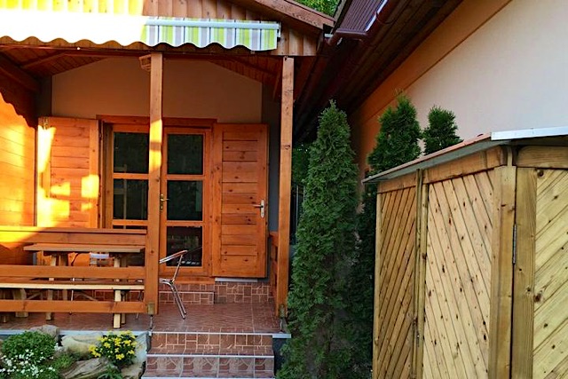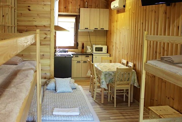 A ház 25 m2-es, 10 m2-es terasszal. 4+2 fő A épületben egy kinyitható kanapé és két emeletes ágy, szekrények, asztal, székek találhatóak. A szoba, konyha és az étkező egy légtérben van. A konyha teljesen felszerelt: kerámia lapos tűzhely, páraelszívó, mikrohullámú sütő, vízforraló, hűtőszekrény, edények, evőeszközök. Ágyneműt, törölközőket biztosítunk. Fürdőszoba: zuhanyfülke, fürdőszoba szekrény, WC, 100 literes vízmelegítő. Légkondicionáló, TV kábelcsatornákkal, wifi. Terasz árnyékolóval.
