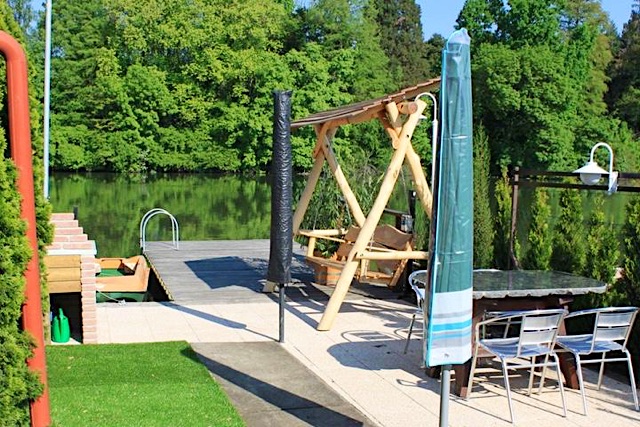 Udvar: kerti asztal, napernyők, hintaágy, grillsütő, bográcsozó hely, mobil gyermekkerítés a vízparton. 18 m2-es stég, csónak, halpucoló.