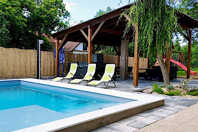 A kertben 5 személyes jacuzzi, épített-süllyesztett medence külön gyermekrésszel, és egy további 100 nm-es fedett teraszközösségi tér, mely külön napozó területtel került kialakításra. A kisebbeket ezen felül hintás-csúszdás rönkfa játszótér valamint trambulin várja a gondozott kertben. Hográcsozásra is lehetőség nyílik, amihez bogrács, grill, illetve bográcsállvány is biztosított. Ezeken kívül a sütögetéshez a szükséges tűzifát is biztosítjuk.
