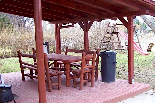 z emeleten franciaágy, heverő, fotelek és panorámás, vízre néző erkély található. Az ablakok szúnyoghálóval, redőnnyel vannak ellátva. A házból kilépve vízpartra néző rönk bútorokkal berendezett hűvös teraszon fogyaszthatják el az étkeket, melyet az udvaron grillezve, bográcsozva vagy tárcsán készíthetnek el. A kényelem érdekében az udvaron további két kiülő található még. A gyermekek a zárt kertben csúszdázhatnak, hintázhatnak a kerti rönk játszókán. A ház klimatizált és a faluból érkező ivóvízzel van ellátva.