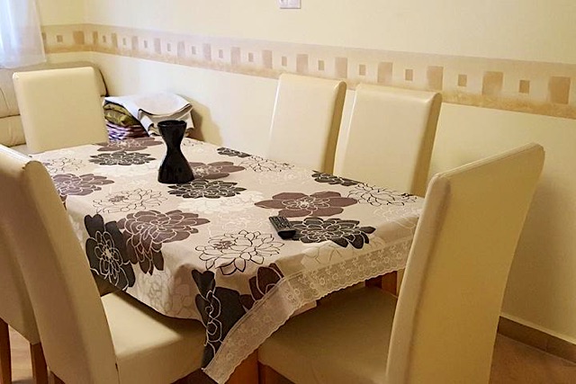 A nyaraló nemrégiben teljes felújításon esett át, mely így 2 szinten kényelmesen 5 fő befogadására lett alkalmas. A földszinten található egy amerikai konyhás teljesen felszerelt (gáztűzhely, hűtő, vízforraló, mikró, kávéfőző, kenyérpirító, stb.) étkezőasztalos nappali, egy külön wc a bejárat mellett, egy különálló tágas hálószoba franciaággyal TV-vel, tusolóval és wc-vel. A