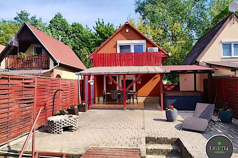 A vendégházban ingyenes Wi-Fi szolgáltatással biztosítjuk, hogy vendégeink a pihenés alatt is elérjék a világhálón lévő információkat. Az alsó szint a hűvösebb évszakokban érkező romantikára vágyó pároknak is csodálatos, hiszen pazar kandalló szolgál a fűtésre, mely az emeleti szintet is gyorsan befűti. Ezen a szinten található a tárolásra alkalmas hatalmas beépített szekrény. Széles lépcső biztonságos, de figyelmet igénylő mozgást biztosít az emeletre történő feljutáshoz.Az alsó szinten található egy zuhanyzóval, mosdóval és WC-vel, felszerelt, frissen felújított, korszerű fürdőszoba.Az emeleti hálószobában 1 db hatalmas méretű francia ágy (200×200), valamint 2 db 1 személyes kényelmes (100×200) ágy található. 4 főnek biztosít kényelmes pihenést. A felső szinten található klimatizált háló mind a nyári melegben, mind pedig az őszi téli időszakban teljes kényelmet biztosít vendégeink számára. Itt egy szobainas szolgálja ki vendégeink tárolási igényeit. Az emeleti szobából egy kényelmes teraszra érkezünk, melyről gyönyörű kilátás nyílik a holtágra.A Vendégház kertje rendezett, dísznövényekkel beültetett.