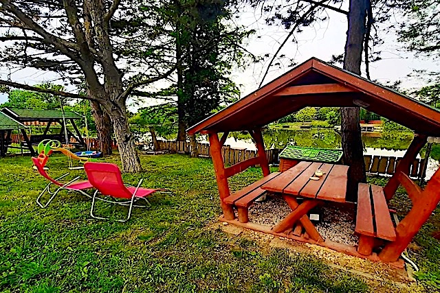 6 személyes fedett vízparti kiülő, saját csónak, 2 db 8 nm-es stég, teljesen kiépített vízpart, lépcsőlejáró és gyerekek részére kibetonozott meder a 2 stég között, napozóágyak, bográcsozázási lehetőség (tűzifa rendelkezésre áll), faszenes grillezési lehetőség, zárható, tágas kutya kenel, hatalmas kutyaházzal. (MA21001476)