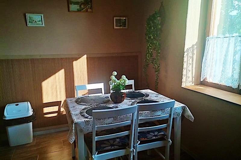A házba belépve a folyosóról jutunk el a két hálószobába, a konyhába, a fürdőszobába, illetve a különálló wcbe. A hálószobák 2 db 1 személyes ággyal rendelkeznek, amik igény esetén franciaágyakká alakíthatóak. Minden szoba önállóan vezérelhető klímával van felszerelve. A házban kábel TV, illetve Wifi található. A konyha teljesen felszerelt hűtővel, amiben található fagyasztó rész, mikrohullámú illetve grillsütővel, kávéfőzővel, kenyérpiritóval, víz forralóval.