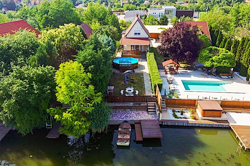 A nyaraló felszereltsége: saját stég, saját csónak, sup, kiváló horgászhely, grillezési, bográcsozási lehetőség, 6 férőhelyes, kisgyermekekkel érkezőknek kérésre biztosítani tudunk: kis kádat állvánnyal,fellépőt,bilit,utazóágyat matraccal,bébiőrt,kismotort,kerti játékokat., medence, trambulin, kandallóval fűthető, a tüzifát a vendégház biztosítja, klimatizált belső tér,alsó és felső térben egyaránt, felszerelt konyha, kv főző, mikró, vízforraló, hűtő, zárt parkoló, tv, interne.