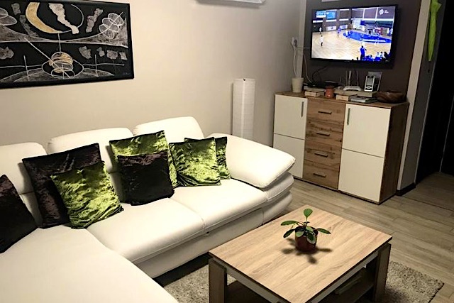 A 2019-ben teljes körűen felújított, 4+2 személyes, klimatizált üdülő földszintjén egy 2 személy részére pótágyazható sarokkanapéval, és több mint 200 csatornás kábel TV-vel felszerelt hangulatos nappali biztosítja Vendégeink kényelmét. Továbbá ezen a szinten található egy tágas, tusolóval, mosdóval, mellékhelyiséggel felszerelt fürdőszoba, melyben párátlanító ventilátor és fűtött törölközőtartó is beszerelésre került a még komfortosabb érzetért.