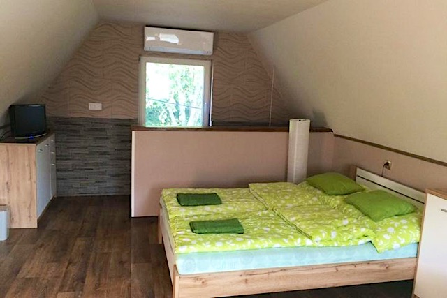 A konyha teljes felszereltségével (elektromos tűzhely, elektromos sütő, pultba épített fagyasztós hűtő, mikrohullámú sütő, páraelszívó, kávéfőző, vízforraló, Hotplate sütő, botmixer, teljes ét- és edénykészlet) Vendégeink rendelkezésére áll, emellett pedig egy beépített mosógép is a konyha részét képezi. Az egész emeleti tér egy hálószobából áll, ahol 2 db francia ágy 4 főnek biztosít kényelmes pihenést. Itt is elhelyezésre került egy több mint 200 csatornás TV. A nyaraló ablakait szúnyoghálók védik. Könyvek gyerekeknek is biztosítottak, illetve társas játékok, valamint 1 pár squash ütő és 1 db gyermek squash ütő a szomszédban bérlehető squash pályához. Ágynemű, wellness törölköző, hajszárító, ingyenes internet hozzáférés és vezetékes ivóvíz is biztosított.
