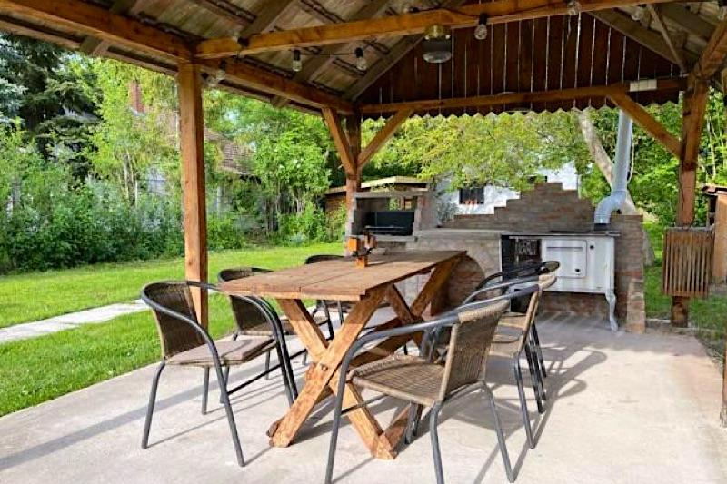 A telken egy óriási filagória is található, ahol felújított sparhertet és más, szalonnasütési és bográcsozási lehetőségeket is találtok. A gyerkőcöknek kedvezve hinta is található a telken, kérésre hordozható gyerekágyat, etetőszéket is tudunk biztosítani. A nyaraló víz felőli oldalán egy kényelmes teraszt találtok, ami egy kültéri nappali hangulatát idézi. Csodás kilátás a vízpartra, kitűnő lehetőség a reggeli kávézáshoz, a délutáni kártyázáshoz, olvasáshoz. (MA24087886)