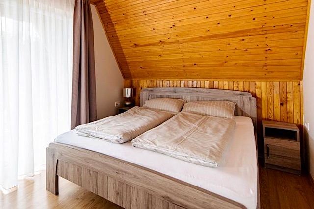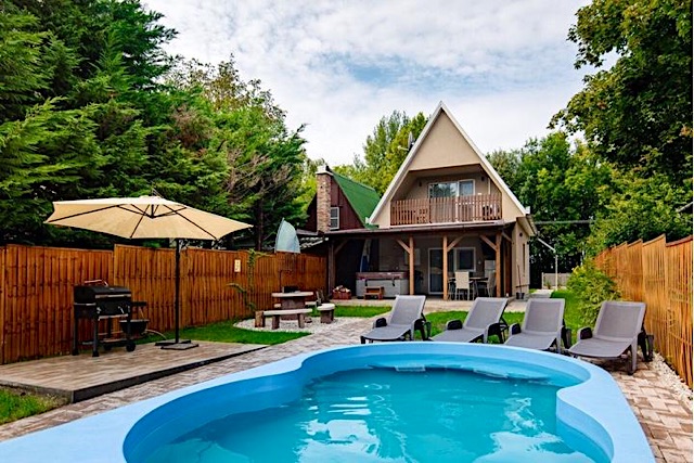 A 2020-ban felújított közvetlen vízparti jakuzzis, medencés 8 fős nyaraló várja Vendégeit. A földszinten kialakításra került klimatizált gépesített amerikai konyhás nappali, ahol helyet kapott egy kétszemélyes kanapé, kávézósarok és TV. A nappaliból nyílik a zuhanyzós fürdőszoba és különálló mosdó. A fenti szinten 2 szoba található. Mindkét szobába 1-1 franciaágy lett elhelyezve illetve 1-1 egyszemélyes ágy. A fenti szinten található még egy mosdó.