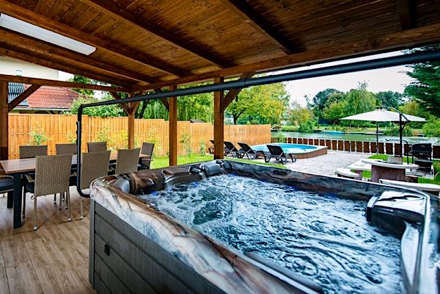 A nappaliból nyíló tágas fedett teraszon a kényelmes kerti bútorok mellett, az egész évben működő jakuzzi gondoskodik Vendégeink kényelméről. A teraszon kiépítésre került egy kültéri konyha, hűtővel és főzőlappal felszerelve. Ágynemű és a teljes házban internet hozzáférés biztosított. A vízellátás fúrt kútról történik, tehát tisztálkodásra alkalmas, azonban fogyasztásra nem.