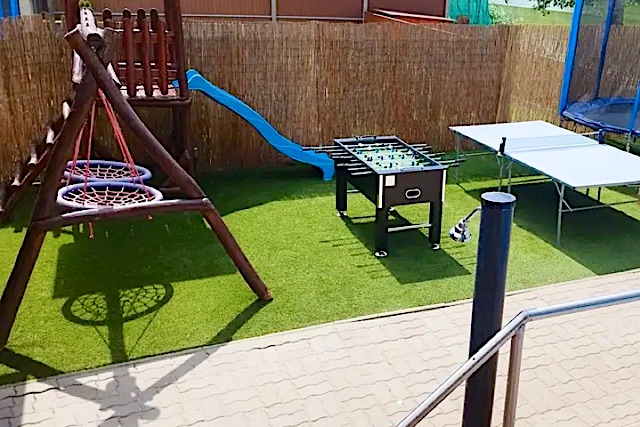 Az udvaron fűtött medence, napozók, kerti-bútorok, grillezéshez szalonnasütő és bográcsozó. A gyerekeknek játszótér, trambulin, valamint csocsó és ping-pong asztal. Az autóknak zárt parkoló. A vízparton nagy stég és ingyenesen használható csónak és vízibicikli. (MA24086194)