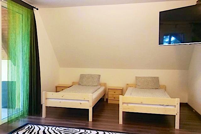 A 2 szintes ház max. 20 fő kényelmes elszállásolására lett kialakítva. Elrendezés 5 szoba, 1 nappali, felszerelt berendezett konyha, 3 fürdőszobaWC, +1 WC külön. 4 személyes szauna. A házat egyidejűleg csak egy társaságnak, vagy bérlőnek adjuk ki.