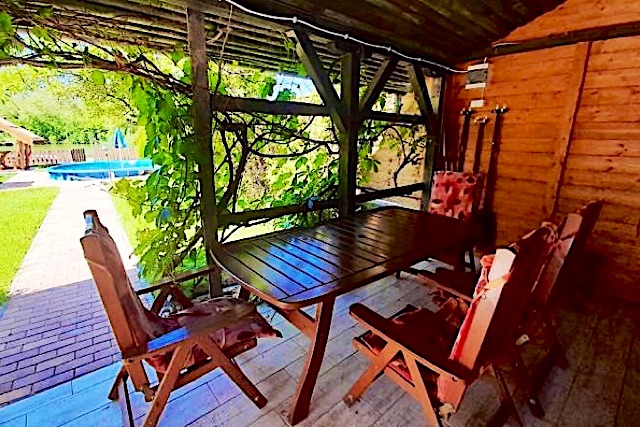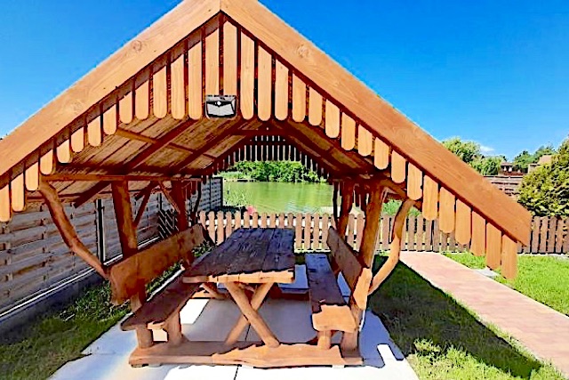 A háztól a partig kandeláberek adják a fényt. A kerítés előtt a parton 6 személyes fedett rönkfa kiülő, szabadtéri étkezésre. Reggeli kávézgatás mellett gyönyörű rálátás a vízre. A Körös-vize nyári időszakban fürödhető, viszont a ház fűtött medencéje biztonságot nyújt az úszni nemigen tudóknak, vagy kisgyermekes családoknak. Nagy stéghez csónak, és vízibicikli jár együtt, ill. 5 személyes kenu.